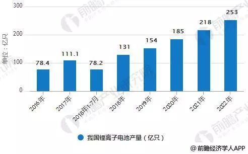2016年,中国锂离子电池产量仅为78.4亿只,同比增长35.8%。到了2017年末,锂离子电池产量达到111.1亿只,同比增长31.3%。截止到2018年1-7月,锂离子电池产量达到78.2亿只,同比增长8.6%。预计2018年我国锂离子电池产量将达到131亿只,未来五年(2018-2022)年均复合增长率约为17.89%,预计到了2022年我国锂离子电池产量将达到253亿只。